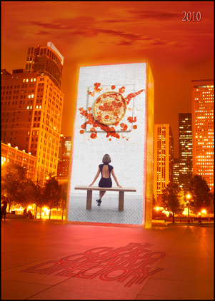 We built the pizza from scratch with the help of a famous ‘Chicago style’ pizza maker...who made our base pizza and provided us with all of the cheese, sauce and pepperoni to create our artwork. For the location shoot, I waited ‘til the screen was blank after I zeroed in the exposure of the night scene. This was to keep the authenticity of the Millennium Park fountain bricks. I needed the pattern of the translucent bricks of the fountain wall to be part of our ‘Pizza in the Wall’ image. The identical raw capture was processed twice, keeping in mind my additional need for the bricks. The image of the bricks was inverted to negative, raised the contrast level, converted to grayscale, then back to RGB. The bricks were then layered with the lady in the pizza gallery, using “hard light” at 50% opacity. The high contrast processing helped our shot but also showed pronounced artifacts in the bricks that were cleaned up. And...there are many, many bricks in that wall!