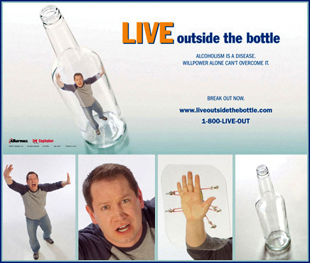 Message In A Bottle When compiling the many pieces for “liveoutsidethebottle.com", we knew that it was going to involve design, production, and one really great message. We created our final scene using our blend of self-designed project management magic. We began by initiating our typical “Don Levey” casting, which our model agencies have developed a love/ hate relationship towards over the years. Probably because of the demanding, but theatrical nature of our work...we want actors, not just models. After deciding upon our liquor bottle, which had no added embossing, our final design for the “portable inside of bottle” had grown from concept to reality. We wanted to create the appearance of pressure upon our actor’s hands. This was done by using clear plastic sheets, which applied pressure to the backs of the hands with small bungee cords. Therefore anywhere their hands were placed it would appear as if they were pressing against a bottle. This was our own personal “Rube Goldberg” torture device. Not to worry though, nobody was hurt in the making of this image! Once all of our pieces were in place we were ready to begin the acting between talent and camera. This is where the real magic is! In post we played “musical heads”, swapping one expression for another. Our creative team, with a little help from my self-designed Rube Goldberg, sent our “Hands-on message in the bottle”.