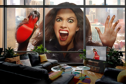I wanted to stage a private drama for the viewer, which juxtaposed various fashion elements. That way, they could tour a supercharged dream world. Enjoy the adventure. Thank you to Eileen…my acting talent (who shared my vision when she accepted the booking), for raising my direction over the top, and to Valerie…my location scout who provided exactly the perfect setting (she didn't mind if I electronically removed a 24" concrete column from the middle of one of our windows). With some cool propping (especially Eileen's shoe tomahawk), and well over 50 layers in Photoshop we completed our self-directed project.