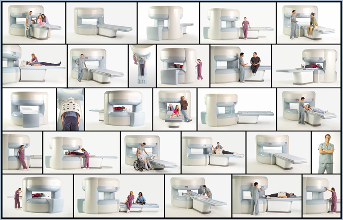 Here’s how we did it: Our studio conducted a three day casting session, while a separate crew obtained the turntable and went to our location and constructed the shooting area around the MRI. The camera, background paper and lighting set-up remained fixed and in place, while we spun the “Oasis” to the correct angle. We built a 30’ wide soft box, which was powered with 6 strobe heads along the right side of the set, plus a 24’ wall of white paper, that reflected light from the left side. Depending upon which angle the “Oasis” was turned, these wide lights acted as either a main light or fill/edge light, which worked beautifully with our additional soft box hanging from the ceiling. Completing this main set was a back wall of white paper that was over 40’ wide. Two additional sets were alternated between for our individual model and product shots. To save time and money, the scheduling between our three sets and models was faultless. We were all part of a perfectly well oiled machine.