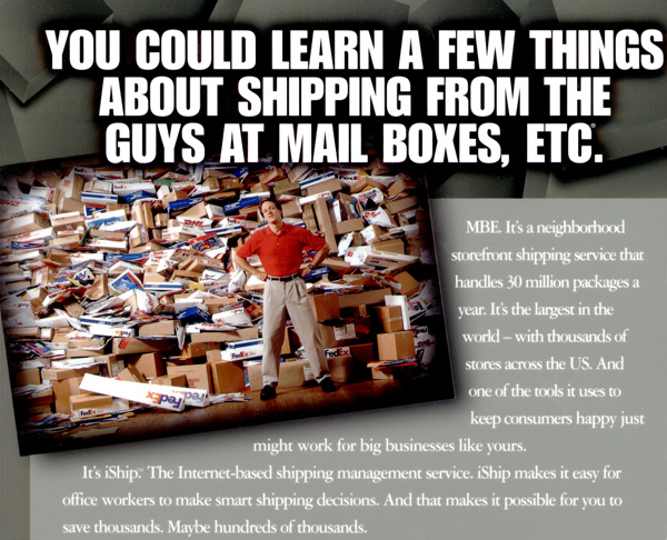 My first reaction to the layout was, "This is fantastic, a wall totally made of boxes?" Our studio quickly named this job "The Avalanche". Investigating our in studio resources for boxes and envelopes we came up 2,589 short. The hunt was on for any container the top shipping companies ever made. We had 6 people obtaining, constructing, and wrapping the parcels. Our superstructure, we built in less than two days, was 20 ft by 14 ft by 10 ft deep. The actual wall was of 2 x 4's and Gatorbord. We had different length and thickness boards as shelves for the packages to be placed on. You could say our lighting was between 'fluorescent industrial' and 'studio chic', which had to cover our large area. We had most of the boxes and envelopes flexibly taped in place so when creative director, Mickey Brazeal walked in, we were able to move that one FedEx box over 2 inches.
