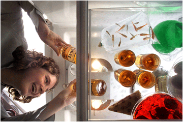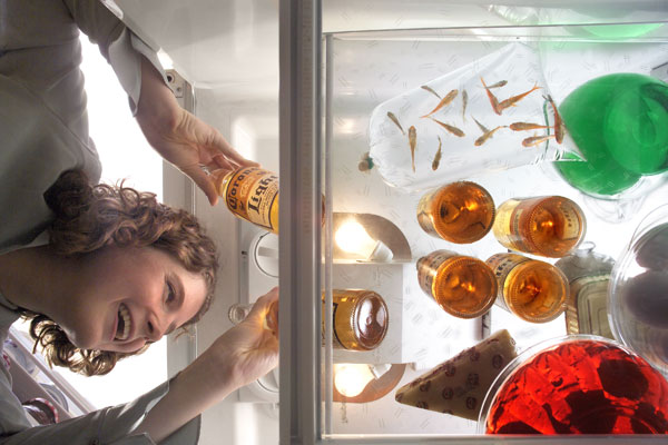 fridge with a 24mm wide angle lens. We used a flat light source (ring light) at the back of the refridgerator to balance light output with the incandesent bulbs. Bouncing additional strobe over the shoulder of our model helped fill in detail in the refrigerator door. We needed to shoot the door separately and photoshop it into place. Shooting tethered to our computer was a great advantage to us, as well as very quick and made adjusting the camera set-up, incrementally possible. What took extremely long was getting approval from the goldfish. Each one wished for a very specific place to be in the bag.
